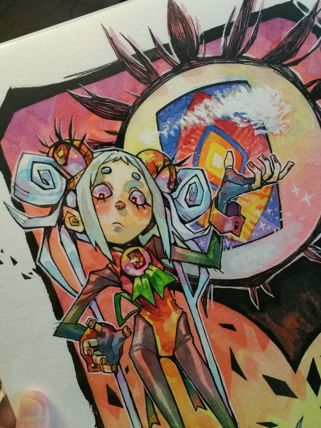 Tools: Sketched with an Eno blue pencil on Fluid watercolor block paper, inked with a dipping pen and Black Star matte ink, colored with India inks and some acrylic inks, touched up with gouache and some colored pencil. Top right had a couple of blue smudges which I painted over with white ink. Texture is noticeable at angles.