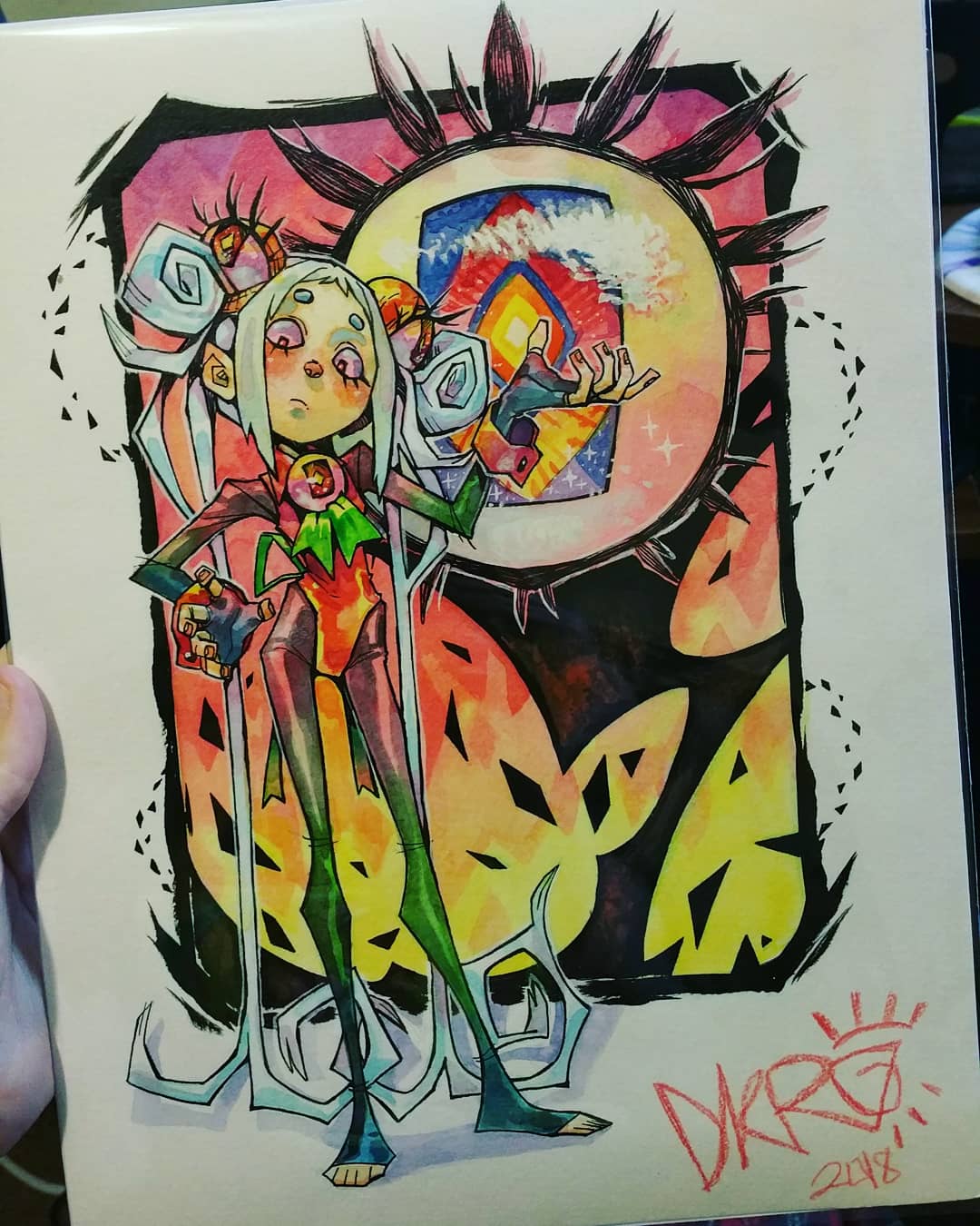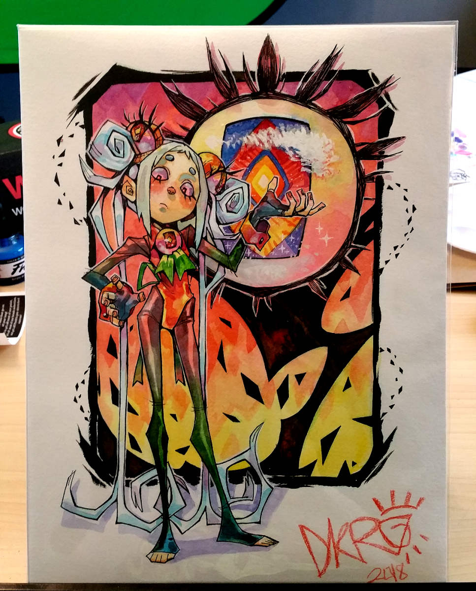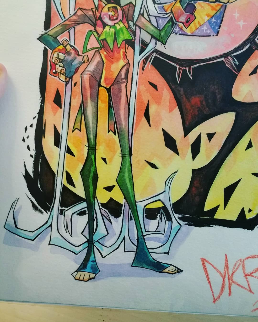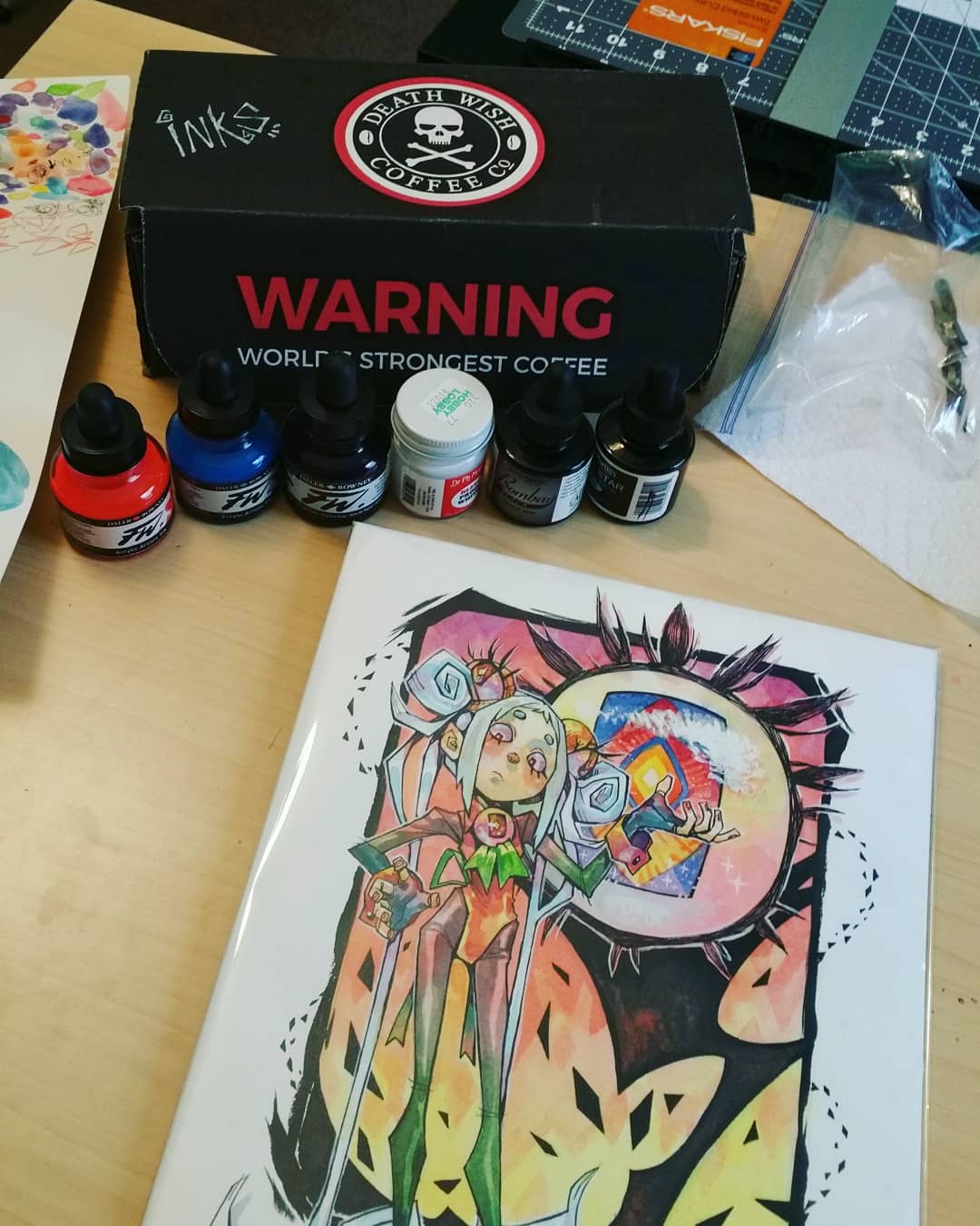 Tools: Sketched with an Eno blue pencil on Fluid watercolor block paper, inked with a dipping pen and Black Star matte ink, colored with India inks and some acrylic inks, touched up with gouache and some colored pencil. Top right had a couple of blue smudges which I painted over with white ink. Texture is noticeable at angles.