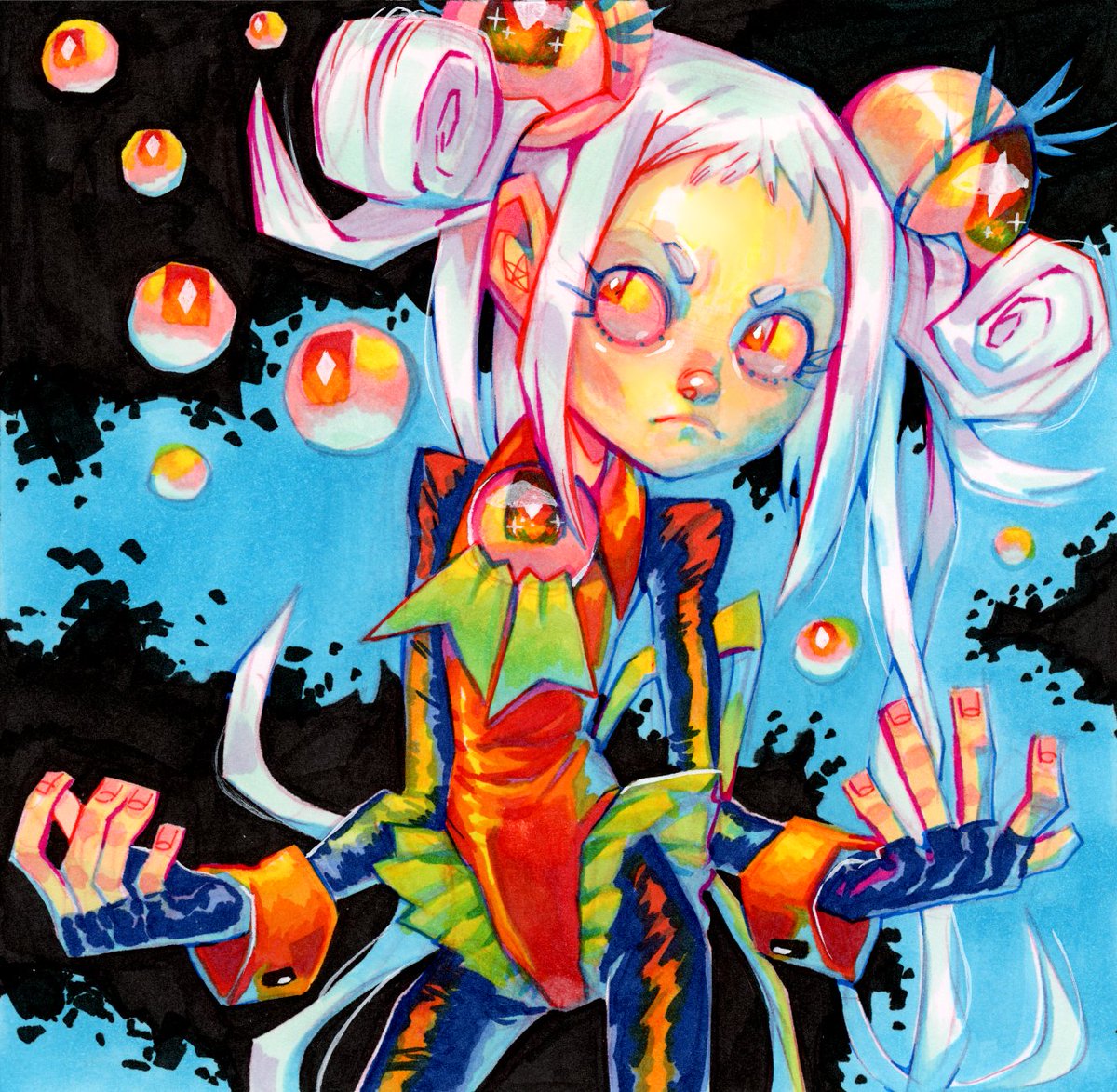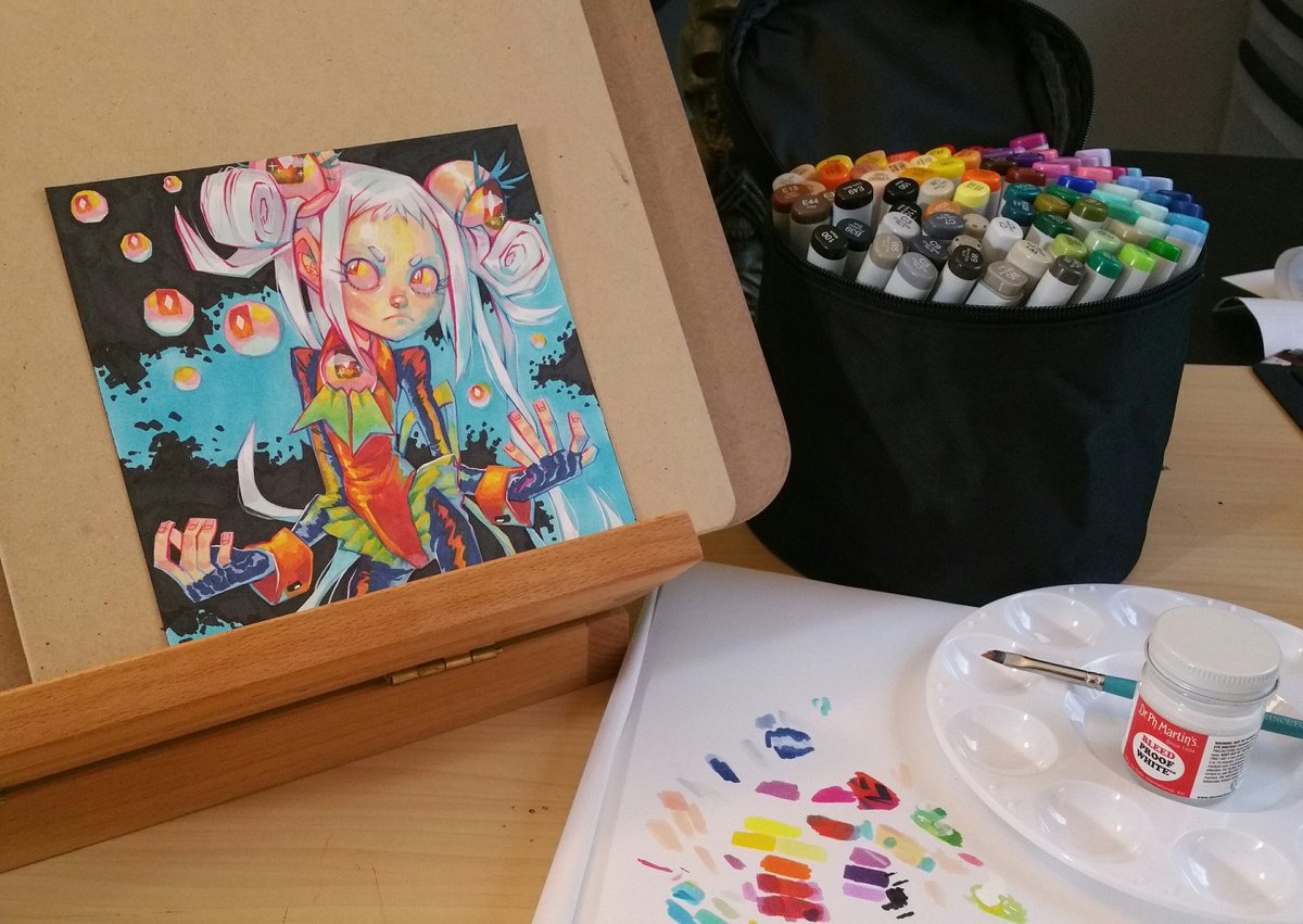 Tools: Sketched with an Eno pencil, and colored with Copic markers. Used Dr. Ph Martin's white bleedproof ink for highlights and details. Red and blue Micron pens for details.
